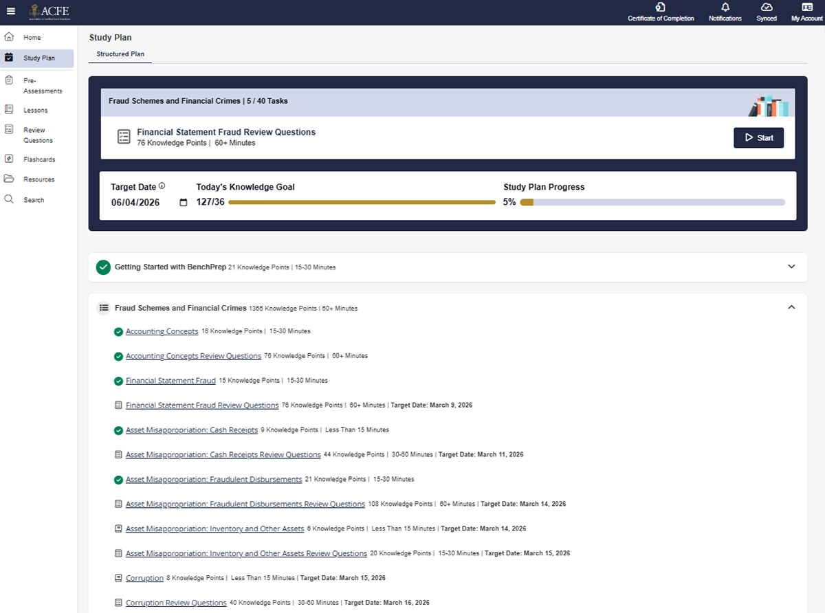The Prep Course streamlines CFE Exam preparation. Use your time more efficiently by focusing on the areas you need to study the most.
